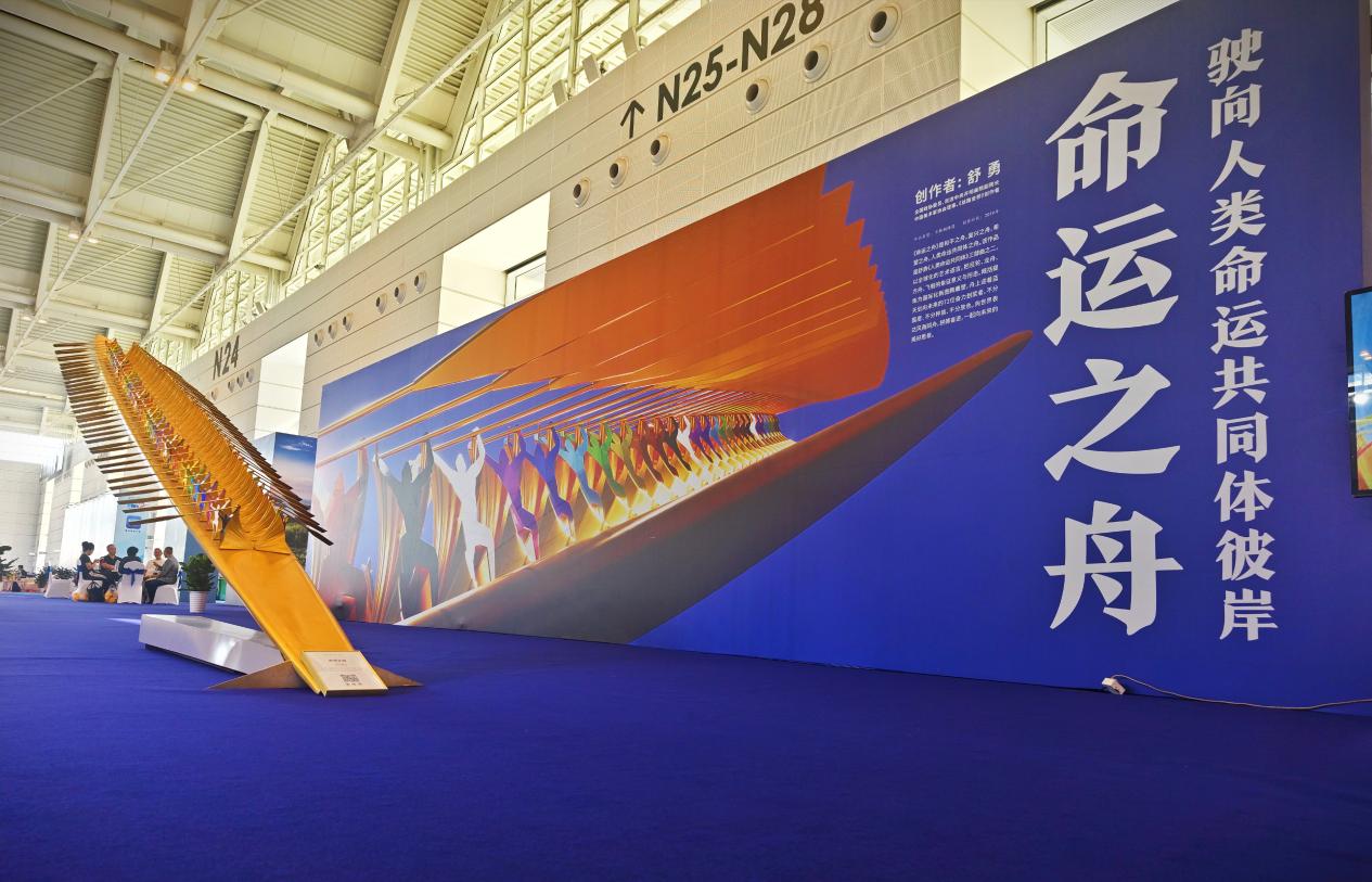 《命運(yùn)之舟》雕塑作品以巨輪、龍舟、方舟、飛船的象征意義與形態(tài),概括提煉為國際化新圖騰雕塑,舟上迎著藍(lán)天劃向未來的72位奮力劃槳者,不分國度、不分種族、不分膚色,這是世界人民風(fēng)雨同舟、命運(yùn)共同的象征。其宏偉的規(guī)模、深刻的寓意和精湛的藝術(shù)手法,成為本次文旅博覽會(huì)的一大亮點(diǎn)。
