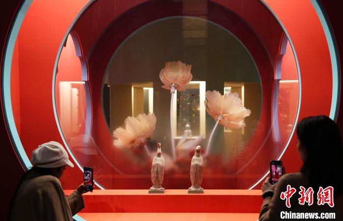 據(jù)介紹,這是蛇類(lèi)紋飾作為裝飾題材出現(xiàn)在商周青銅禮器之上的一種典型代表。半人半蛇的唐代“伏羲女?huà)z像立幅”帛畫(huà),印證著伏羲女?huà)z這一久遠(yuǎn)的文化信仰,通過(guò)絹帛畫(huà)形式在當(dāng)時(shí)的吐魯番地區(qū)傳播,并吸引其他民族的崇奉。此外,展廳中充滿新春氛圍感的桃花洞釉燈籠瓶、白玉“天官賜福”佩、“好酒”白釉盤(pán)等近200余件(套)館藏文物精品,書(shū)寫(xiě)著對(duì)即將到來(lái)的蛇年新春的期待和祝福。