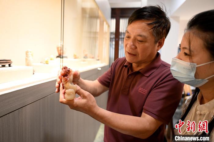 5月8日,在中國工藝美術(shù)大師、壽山石雕大師陳益晶位于福建省福州市壽山石鑒定中心的工作室里,年逾七旬的陳益晶向游客介紹壽山石雕作品。中新網(wǎng)記者 呂明 攝