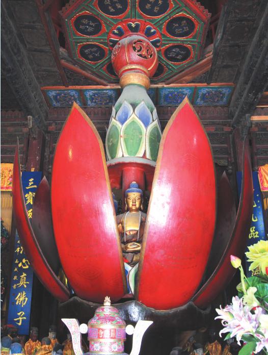 開花現(xiàn)佛 五臺山羅睺寺的大藏經(jīng)閣中央,有一朵高大肥碩的紅色蓮花,形狀美觀,氣勢宏偉。蓮花置于磚砌的方形臺座上,座高1米,邊長3.6米,其上裝有一個圓盤,上刻浪花翻滾的圖案。浪花上站著神態(tài)各異的十八羅漢,好似乘風(fēng)破浪,前去聽法。圓盤外的方臺上,塑著二十四諸天,方臺四角有四大天王。圓盤正中,裝著一朵3米多高的木制蓮花,蓮花是由八片蓮瓣組成,花蕊是面向四方的四尊佛像,即釋迦牟尼佛、阿彌陀佛、藥師佛和彌勒佛。從花蕊里又伸出一枝含苞欲放的花蕾,直插到二層樓內(nèi)?;ò昱c花柄連接處安有活動機關(guān),花柄是一根粗壯的主軸,下部通過一個很大的圓木盤,木盤下面裝有絞絲齒輪。在方形臺座的下面有一個地下室,安有轉(zhuǎn)輪設(shè)施,經(jīng)人操縱,圓盤上的二十四諸天便圍著花柄轉(zhuǎn)動起來,接著,八片蓮花瓣徐徐張開,露出蓮中四佛,這就是所謂的“開花見佛”。若停止轉(zhuǎn)動,花瓣自動閉合,佛像隱藏其中。 獨特的開花現(xiàn)佛,為五臺山最精巧的道場藝術(shù)品。 千佛銅殿 在五臺山顯通寺千缽文殊殿后面,有一座造型美觀、雕鏤精細(xì)的銅殿。為明代僧人妙峰祖師化緣聚錢用10萬斤銅于萬歷三十四年(1606年)鑄成。銅殿高5米,寬4.7米,深4.2米,重檐歇山頂。銅殿從外表看分上下兩層,四角各有四根銅柱,銅柱和柱礎(chǔ)合為一體。上層四面安有24塊隔扇,每面6塊。下層四面安有32塊隔扇,每面8塊。隔扇兩端雕刻著草木花卉、飛禽走獸,神態(tài)逼真。正面橫梁上的“二龍戲珠”和“雙鳳朝陽”更是活靈活現(xiàn)。殿脊的兩端有銅鑄的似龍非龍的寶瓶,光芒四射,耀眼奪目。 殿內(nèi)供奉著一尊文殊騎狻猊銅像。狻猊體態(tài)雄健,昂然回首,背上馱著圓形蓮臺,文殊菩薩半跏趺坐在蓮臺上,手作說法印,面目慈祥。殿內(nèi)四壁上,整整齊齊地布滿了雕鏤精美、神態(tài)各異的小銅佛,號稱一萬,稱之為“萬佛朝文殊”。 三乘銅牛