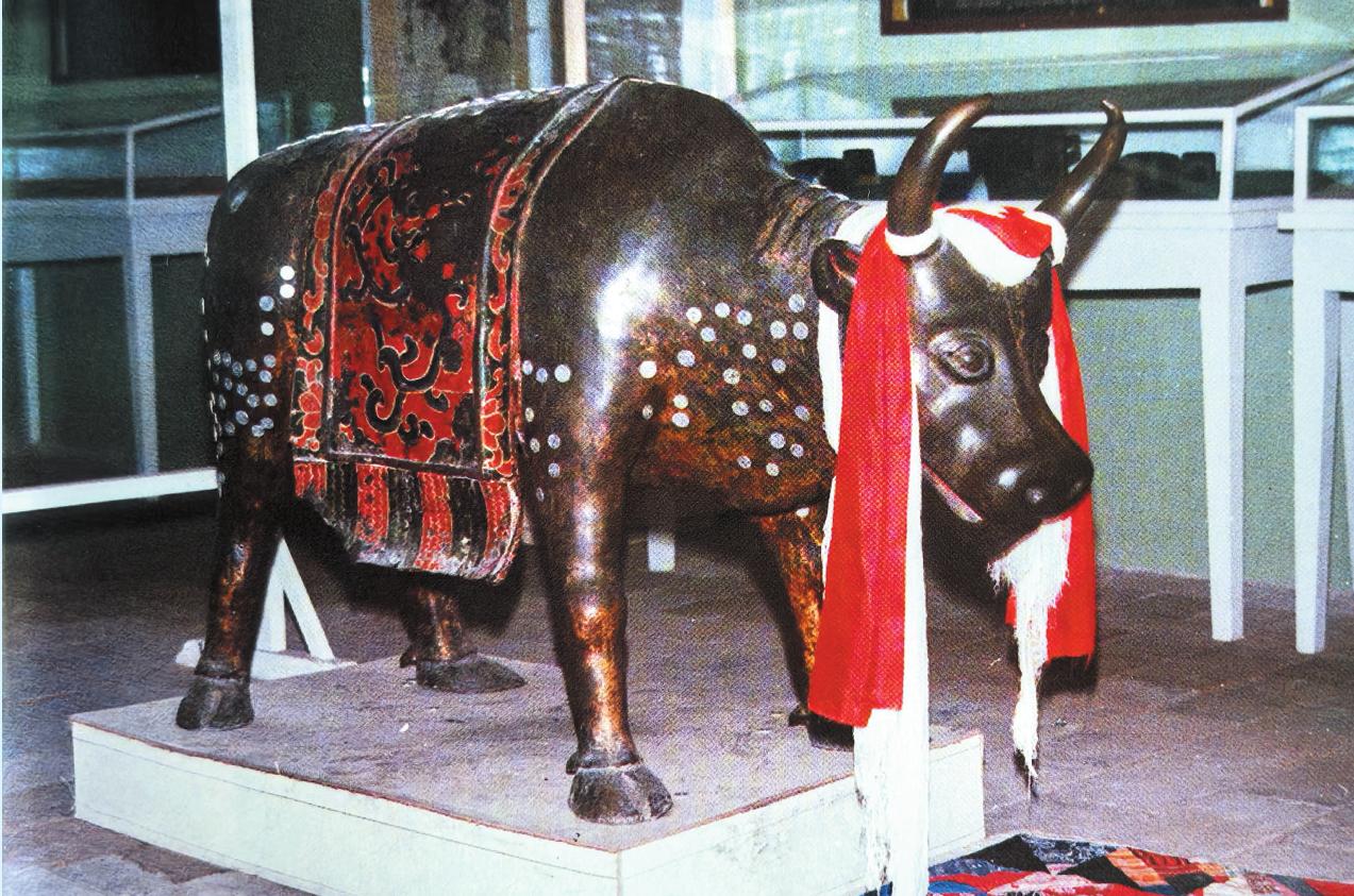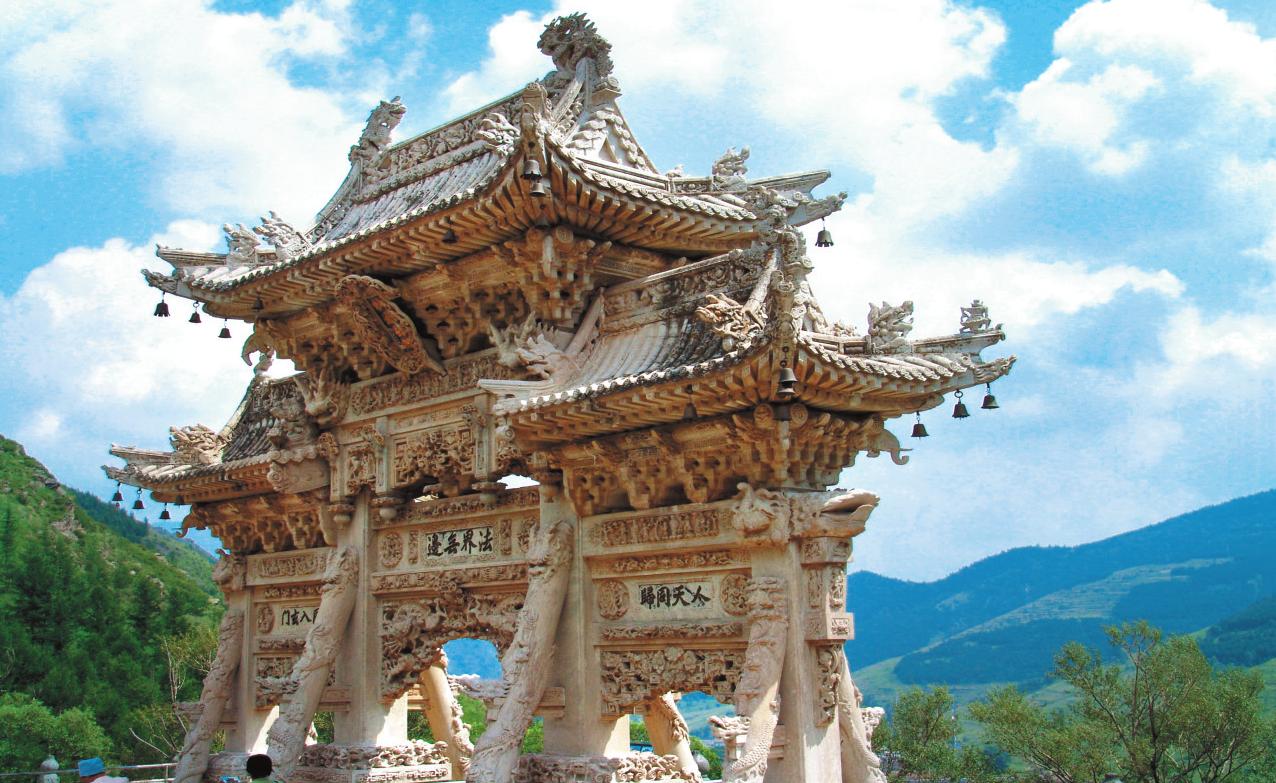 三乘銅牛 王文君 攝 五臺山保存著一尊工藝精細(xì)、形態(tài)逼真、傳神入化的明代銅牛。這尊堪稱鑄造藝術(shù)品中佳品的銅牛,收藏在顯通寺藏珍樓內(nèi),通高85厘米,長146厘米。它體魄雄偉,頭向前伸,分足而立,兩角內(nèi)收,閉嘴蓄力,圓目正視,奮力前行。銅牛四足協(xié)調(diào),造型逼真。銅牛的腰部有披墊,披墊上面繪有各種彩色花紋。銅牛原來還拉著一輛精致的銅車。車棚、輪、軸及車上的繩索均為銅質(zhì)。文物部門鑒定其為國家一級文物。 銅牛原在大社寺,因此曾被稱為“大社銅?!?。在佛教中,把三種修行的途徑比作乘坐的三種車,三車又喻為三乘,羊車喻小乘聲聞,鹿車喻中乘緣覺,牛車喻大乘菩薩。五臺山這尊銅牛、這輛銅車,正是象征著“三乘”中最為尊貴的菩薩乘。 龍泉牌樓