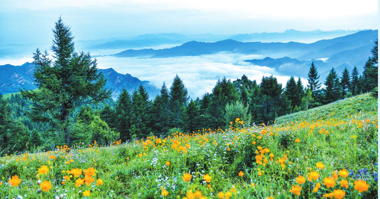 云頂花海 王光宏 攝 駝梁地形四周封閉,中為谷地,形成了山巒綿亙、溝壑縱橫、河川橫跨東西的自然生態(tài)景觀。其主峰海拔2281米,為“晉冀兩省四縣”交匯處,駝峰山巒蜿蜒,此起彼伏,猶如“靜臥巨駝”而取名駝梁。與五臺山風(fēng)景名勝區(qū)東北相望,遙相呼應(yīng),有其獨特和不可替代之優(yōu)勢,同為五臺山旅游資源亮點。由山谷到山頂分布著落葉林混交林帶、樺樹林帶、落葉松林帶,生物垂直分布變化明顯。駝梁頂部,有一片亞高山草甸,約近萬畝的茵茵綠草,像碩大無比的地毯,與天際交接,一望無垠。隱于藍(lán)天白云和松林綠波之間,散落著漫山遍野的杜鵑花、金蓮花、百合花、燈籠花等,置身其間,如進花海,恍若仙境。因位于云霧縹緲的高山之巔,故被人譽為“云頂花?!?。 南梁仙境