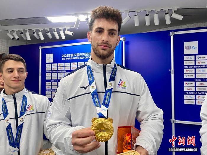 8月10日晚,成都世運(yùn)會期間,以色列蹦床運(yùn)動員羅特姆·阿米海(Rotem Amihai)展示獎牌,該獎牌綬帶采用蜀繡工藝。王利文 攝
