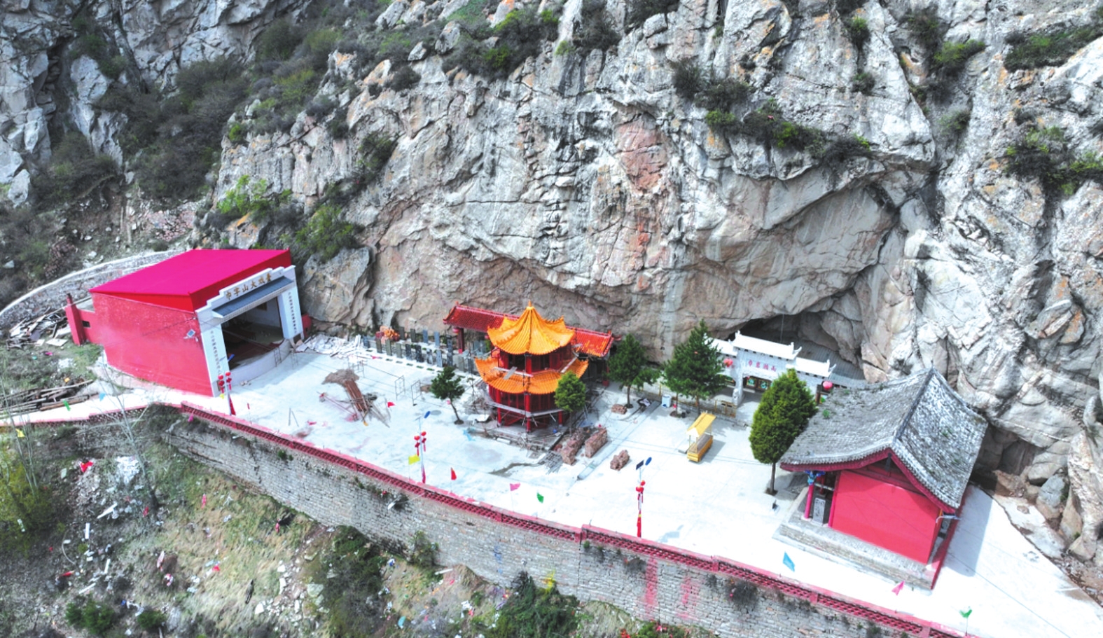 春日里,山桃花與山杏花沿坡綻放,粉白相間的花海從山腳漫至山腰,與翠綠的松柏相映成趣。此時若恰逢細雨,云霧在花間游走,“巾巖瀨雨”的奇景尤為靈動,水滴擊石的清音與花開的簌簌聲交織,仿佛天地間的私語。盛夏時節(jié),山中松濤陣陣,涼意襲人。雙巾峰下的“沁心泉”水量充沛,泉水清冽甘醇,飲之可去暑熱。沿山路行至“回音壁”,一聲呼喊能引來七聲回應,故又稱“七響巖”。傍晚時分,夕陽為石灰?guī)r峰巒鍍上金邊,池面波光粼粼,形成“巾峰夕照”的景致,與“瀨雨”并稱山中雙絕。秋日登高,則見株株松樹挺拔直立,廟宇與油松交相輝映,層林盡染。此時“瀨雨”之景尤為別致,洞內泉水如鐘表滴答,當?shù)厝朔Q為“秋漏”。有現(xiàn)代詩人描繪此景:“巾巖雄峙,霧繞云纏多靈氣;瀨雨淋漓,珠垂墜玉一奇觀?!毙蜗蟮匕炎匀恢襞c時間之感巧妙融合。冬雪初霽時,巾字山銀裝素裹,雙巾峰如白玉雕琢的冠冕,“瀨雨”洞洞外凝結的冰棱如水晶簾幕,陽光折射下七彩斑斕,構成冬日里的清麗樂章。