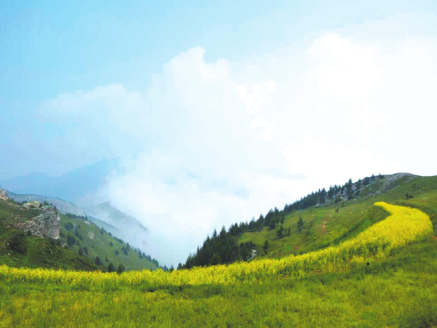 油菜花漫山遍野。楊晉生攝 三 這座老君廟開鑿于峰巒半腰,面臨絕壁,其險異常。幸得今人用粗大鐵管焊接成簡易護欄和扶手,游人才不至于恐高懼怕。 身在高處,憑欄遠(yuǎn)眺,綿亙的大山盡收眼底,那條通村的路似半個圓環(huán),緊貼著老君洞山峰的山底,向相反的兩個方向延伸。群山、濃霧、翠峰、白羊、彎道,就這樣被收進(jìn)了取景框,定格為一幅美景。 每年的農(nóng)歷五月十一,是黑水圪妥村一年中最紅火熱鬧的一天,平時荒寂清冷的村莊,這一天便籠罩在一片歡樂祥和的氣氛中。從四面八方趕回村的人,握手擁抱,熱情問好,相互問長問短,每個人的臉上都洋溢著開心的笑容,感覺非常親切。八音會也來伴奏,演奏者做著準(zhǔn)備工作。五月天,山上的氣溫和山下反差太大,山下時值高溫天氣,山上還得生火取暖,早晚還得穿棉衣。 廟會議程是先拜村里曾經(jīng)的老廟,一般由村里年紀(jì)大的長者前往祭祀。老廟的正面原來是龍王廟,由于年代久了已倒塌,大門右邊一間還比較完整的小房子是奶奶廟。很簡陋的老房子,很簡單的牌位。 據(jù)老人們說,老君洞與五臺山隔山相望,古人原想在老君洞頂端仿五臺山建造廟宇群,但因峰頂分為四塊,故未能如愿。后來,村人商量在山腳下建廟,陸續(xù)將所需材料備齊安置于峰底處,沒想到那么多建材一夜間竟被轉(zhuǎn)移到了半山腰處,眾人相信這一定是神仙所為,故將老君廟建于此處。 原平最高峰的廟會,沒有喧鬧的文藝表演,沒有擺攤的商販,沒有擁擠的人流,但早晨的紅粥,中午的油炸糕,純樸善良的村民,熱情好客的村干部,給人以回家的感覺。 午后,云霧突然變濃,從山谷間涌動而來,山中的空氣變得凝重了。有人說,軒崗正在下大雨,這里是不是馬上也會有雨來。老鄉(xiāng)接話說,沒事,這里沒事,要下也不會這時下。軒崗下雨是從微信里知道的,這里不會下的理由是什么就不得而知了。于是,青青草地上,有女子正襟危坐,手撫古琴,一陣低沉、悠揚的琴聲像從云霧里傳出來,似乎飄逸著神秘的氣息。 黑水圪妥老君洞,原平海拔最高的地方,氣候宜人,空氣清新,林木密布,山花爛漫,自然與人文相融相生,猶如人間仙境。 (責(zé)任編輯:盧相?。?/span> |