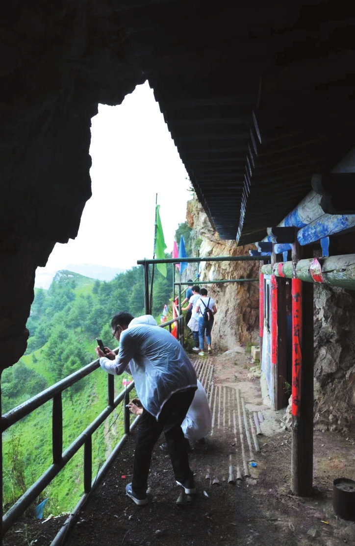 老君廟。楊晉生攝 二 到黑水圪妥,不游老君洞就不算登頂。 老君洞主峰聳立在村后不遠(yuǎn)處,被松柏林團團簇?fù)碇?,顯出氣勢不凡的高大威猛。順著山路攀上斜坡,距松柏林不遠(yuǎn)處豎著一塊指示牌,上寫“老君廟”。繼續(xù)向峰頂靠攏,需穿越一片樹林,山風(fēng)掠過松枝、松針和松球,吹在人們身上,頓時增添了精氣神。 從老君洞主峰下的羊腸小道向前走,可望見峰巒半腰間露出建筑物一角,那便是老君廟了。登臨老君廟,依靠在山的裂縫里開鑿出的一條棧道,一腳一蹬,一步一攀,急不得,快不了,就這樣亦步亦趨才能抵達(dá)這座懸在半空的小廟。 據(jù)悉,老君廟始建于清道光年間,現(xiàn)如今的建筑是1996年重新修復(fù)的,每年的農(nóng)歷五月十一為老君廟廟會。就在第一洞穴前,懸掛有一幅噴繪的“老君廟簡介”,上面有“老君洞,山名也。位于長梁溝鎮(zhèn)黑水圪妥村南,海拔2384米,為原平第一高峰,登頂極目遠(yuǎn)眺,方百里盡收眼底。山頂有廟焉,有云岡、龍門石窟之韻,鑿壁為龕,通稱老君廟……”的介紹。 在懸空的棧道上,有殘碑兩截丟棄一旁,上鐫清末時捐款修廟的人名,是真正的舊物。還有一只小鐵鐘懸掛在老君廟前,銘文上的鑄鐘時間是“民國三年”。小廟后面藏著第二個洞穴,相傳可通往數(shù)十里之遙的陽武口,這里流傳著不少神秘莫測的故事。