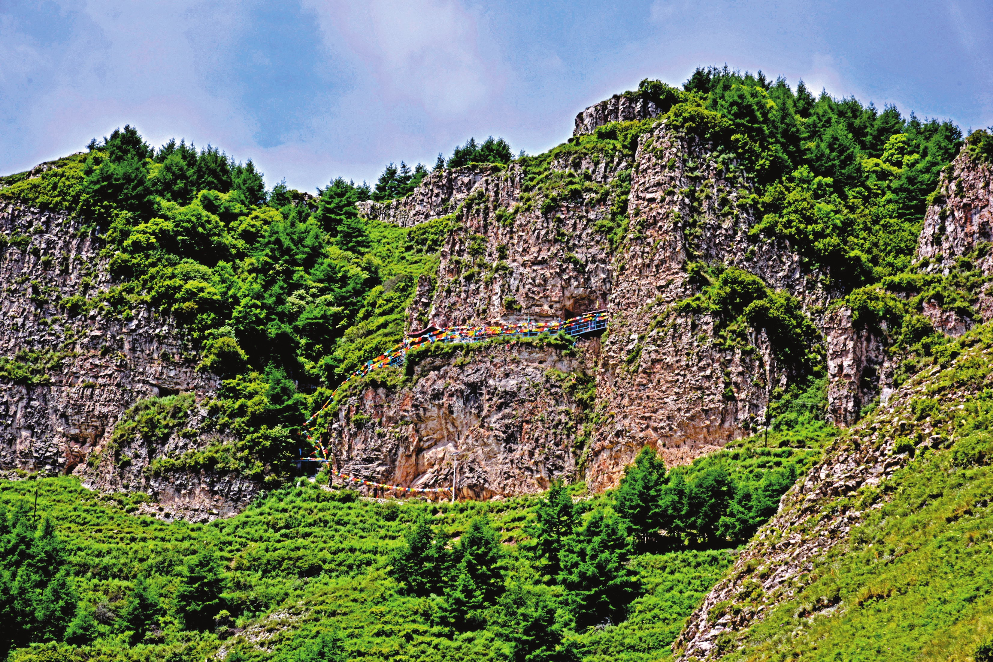 老君洞。趙宏偉攝 老君洞,是一個洞名,也是一座山峰的大名。 它就在逶迤連綿的云中山脈原平版圖內(nèi),是云中山的最高峰。 一 原平西部山區(qū),大山褶皺的植被豐茂處,郁郁蔥蔥,綠色辣眼。一道山谷內(nèi),有車輛在曲曲彎彎的山道上時隱時現(xiàn),車后蕩起的塵土許久才消散殆盡。 這道峽谷,兩旁山勢陡峭,崚嶒的山石讓瘋長的植物遮蓋得嚴(yán)嚴(yán)實實,楊樹、柳樹、松樹、柏樹、樺樹等許多樹種兀自生長,枝葉卻互相糾纏在一起,十分繁盛。上山的路是一條水泥單行道,細(xì)長細(xì)長地縈繞在山谷間,路側(cè)有灌木和野草蓬蓬勃勃地遮擋了少半邊,一不留神,前車便掩映在樹叢中不見蹤跡。一種身形高挺的植物,長成一叢叢、一簇簇,頂端雪白的小碎花平整地組合在一起,像極了薄薄的一只碟子。那么,由幾只這樣的“碟子”或高或低形成一片,便十分有趣了。 上到山頂,眼前豁然開朗。近處有草坡鋪陳,松樹成林,遠(yuǎn)處卻是十萬大山籠罩在濃密的云霧里,白茫茫無邊無際宛如汪洋大海。 山路傍著山坡最緩處向前延伸,愈加彎曲,轉(zhuǎn)過山峰的陽面,一個建筑在山坡上的村落逐漸顯露出來——這是黑水圪妥村,原平海拔最高的村子。 而黑水圪妥村旁邊的老君洞主峰,海拔2384米,雄踞原平所有大山之首。