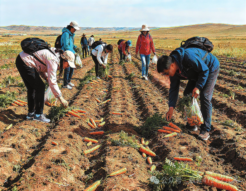 “撿秋”游演繹著“鄉(xiāng)土中國”的現(xiàn)代篇章。費孝通在《鄉(xiāng)土中國》開篇即言“從基層上看去,中國社會是鄉(xiāng)土性的”。這種“鄉(xiāng)土性”的核心是人與土地的深度綁定。農(nóng)民靠土地生存,土地是文化認(rèn)同的根基?!皳烨铩边@種農(nóng)耕活動,如今以更加鮮活方式延續(xù)下來。對農(nóng)民而言,土地不僅是謀生手段,更是安身立命的“精神原鄉(xiāng)”。而城市游客的參與則賦予了“撿秋”新的意義。在城市里待久了,就想蹲在田里感受泥土的溫度,游客“撿秋”體驗的是“春種秋收”踏實感。這種體驗式參與是現(xiàn)代人對鄉(xiāng)土文明的“情感反哺”。游客們彎腰的身影既是對土地的致敬,也是對“根”的追尋。他們未必真懂農(nóng)事,但通過參與“撿秋”完成了對鄉(xiāng)土文化的認(rèn)同,被撿起的“果實”從“生存作物”演變?yōu)椤拔幕浇椤薄.?dāng)前,內(nèi)蒙古各地推出的挖土豆、烤土豆等旅游項目是對鄉(xiāng)土資源的文化再“編碼”,當(dāng)土豆從田間走向游客的后備箱,“鄉(xiāng)土中國”便獲得了更加豐富的表達(dá)。