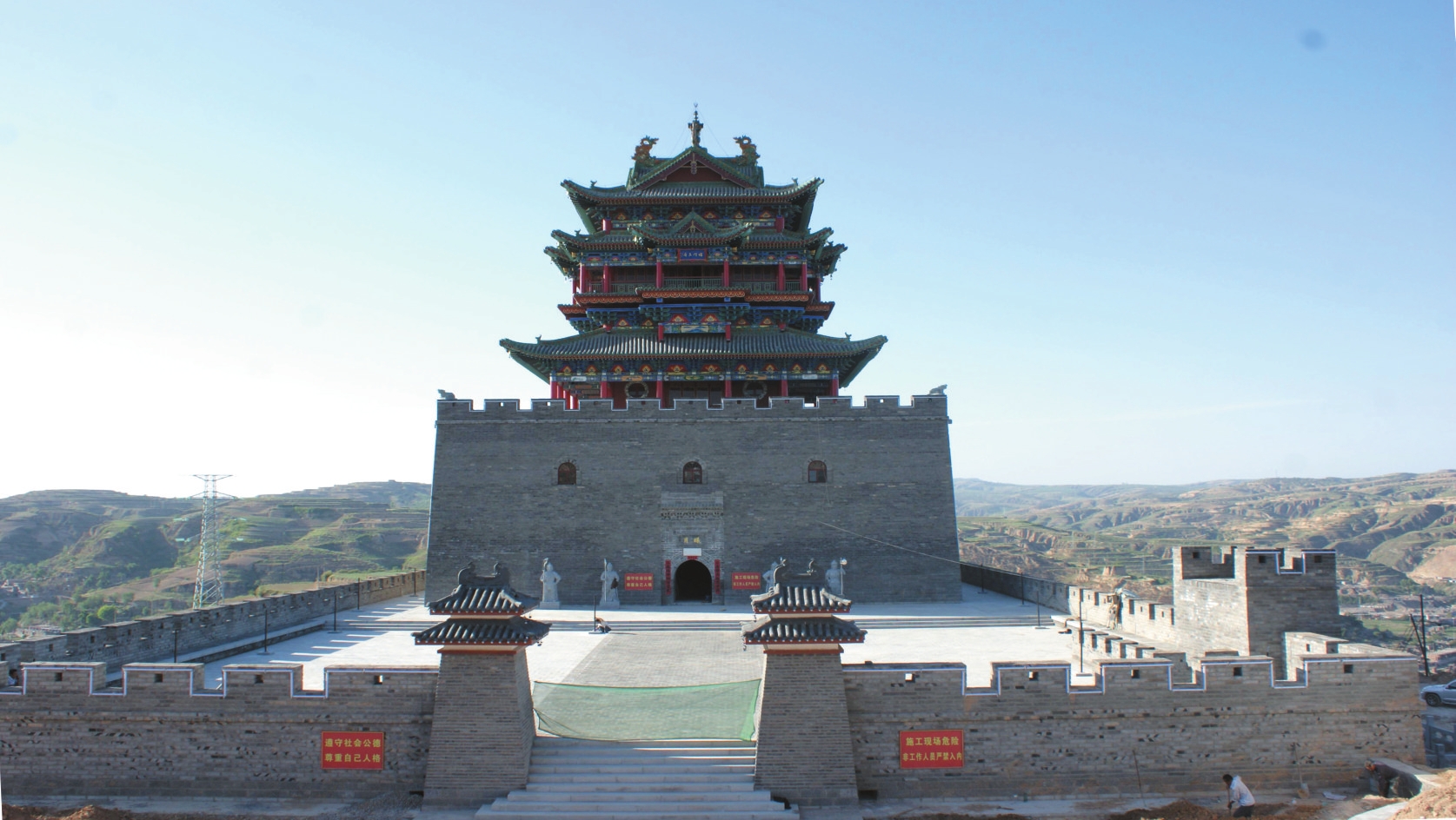 2011年至2012年,護(hù)城樓于原址復(fù)建為鋼筋混凝土仿古建筑。新建城堡南北長(zhǎng)70米、東西寬36米,堡東開(kāi)一拱門(mén),外包磚,內(nèi)填素土并夯實(shí),城墻上砌筑垛口。護(hù)城樓為方形,通高28.8米,其中墩臺(tái)高12米、寬28米;樓身高19米、寬20米。