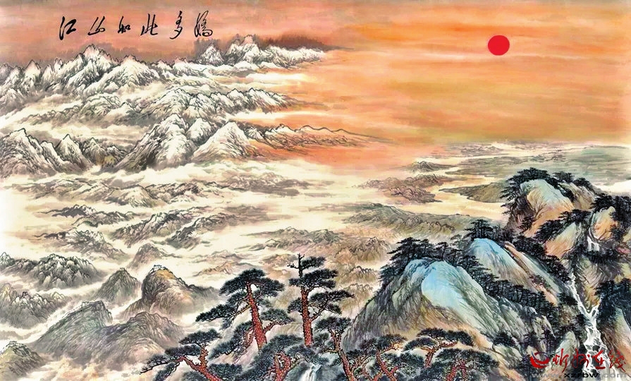 李可染將西畫(huà)中的明暗法引入中國(guó)畫(huà),使其和諧融化在深厚的傳統(tǒng)筆墨和造型意象之中。在他的《北國(guó)風(fēng)光》里,長(zhǎng)城依偎著崇山峻嶺,黃河親吻著無(wú)垠大地,以各自獨(dú)特的曲線(xiàn)形態(tài),縱向貫穿畫(huà)面,拓展出無(wú)比豐富的層次。天地原本的冷色被暖光驅(qū)散,使得一幅畫(huà)有萬(wàn)千氣象,那正是“須晴日,看紅裝素裹,分外妖嬈”中展現(xiàn)的豪情與廣闊胸襟。