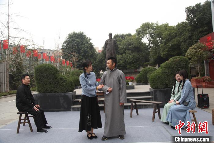 張瀾在教育子女時誕生了很多有意義的小故事,我們選取了其中幾個,編排成15分鐘的情景劇。情景劇這種形式,第一個優(yōu)點是時間短,游客來紀(jì)念館參觀——預(yù)計參觀1個小時吧,花15分鐘看這出劇,輕輕松松就能看完;第二個優(yōu)點是不占地方,我們一般在紀(jì)念館的銅像廣場演出,下雨的話就改到展廳里做室內(nèi)演出。我們這兒是古建筑,在里面演出是很有感覺的。