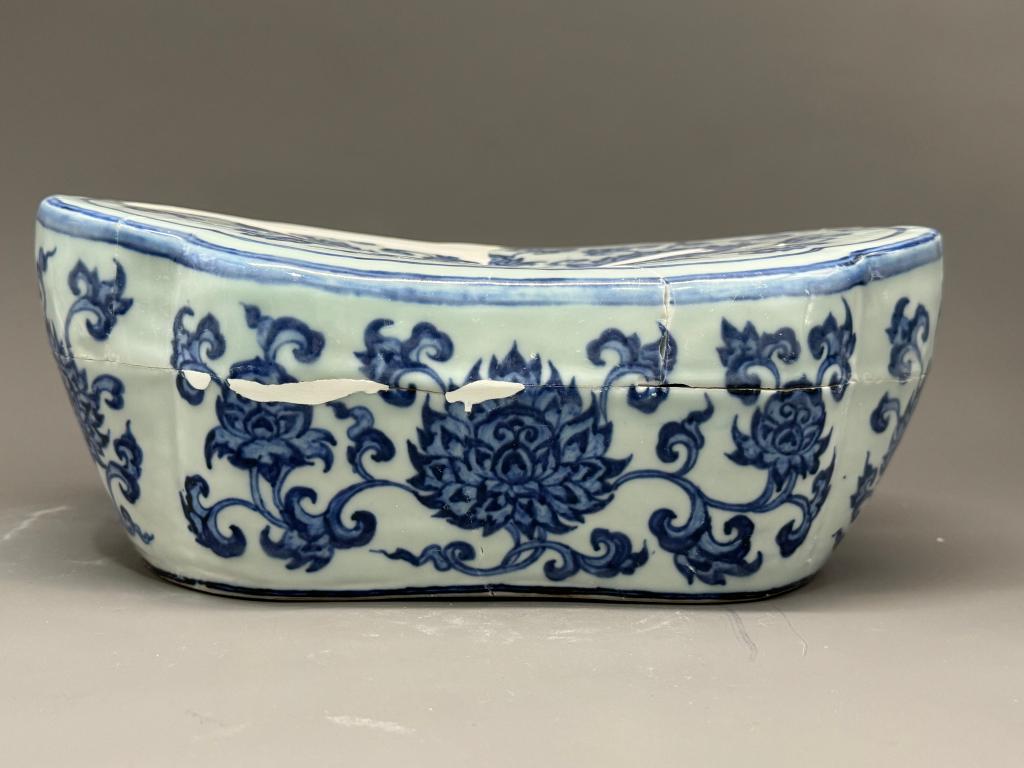 修復(fù)后的瓷枕器形一致,大小在長(zhǎng)31.5厘米、寬23厘米、高12.3厘米左右。枕呈如意頭形,中空、枕面微凹、平底。枕面邊沿隨枕形勾勒雙線(xiàn)邊飾,其內(nèi)繪青花花卉紋飾,側(cè)壁亦繪青花花卉紋飾。外底中間銅錢(qián)紋,以作排氣用。