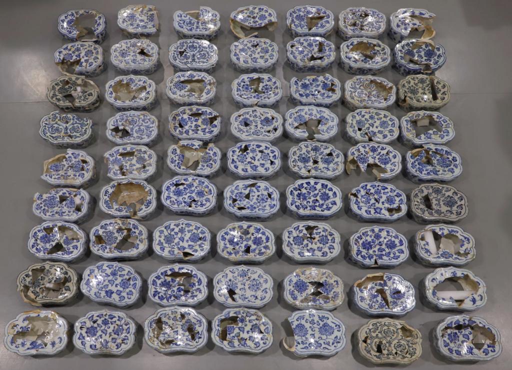 位于江西的景德鎮(zhèn)御窯博物館內(nèi)有一面“網(wǎng)紅墻”,展示了65件明代“空白期”青花瓷枕的修復(fù)件。這些瓷枕曾以碎片的形態(tài)深埋地下十余米數(shù)百年,又在文物修復(fù)師手中重獲新生,成為研究“空白期”官窯瓷器的重要實(shí)物依據(jù)。