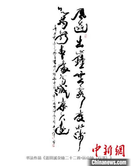 此次參展的《藍(lán)田溪雜詠二十二首·遠(yuǎn)山鐘(行書(shū))》是韓天衡精心創(chuàng)作的書(shū)法作品。他深入感受古詩(shī)的韻律和意境,將詩(shī)意融入筆墨之中,作品筆勢(shì)流暢、氣韻生動(dòng),展現(xiàn)了漢字的靈動(dòng)之美與深厚的文化底蘊(yùn)。