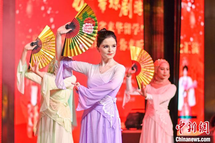 1月22日晚,海南省來華留學(xué)生“瓊韻華章之瓦唱瓊劇、你來聽”非遺匯演在??谂e行,外國留學(xué)生表演折扇舞。 肖若洋 攝
