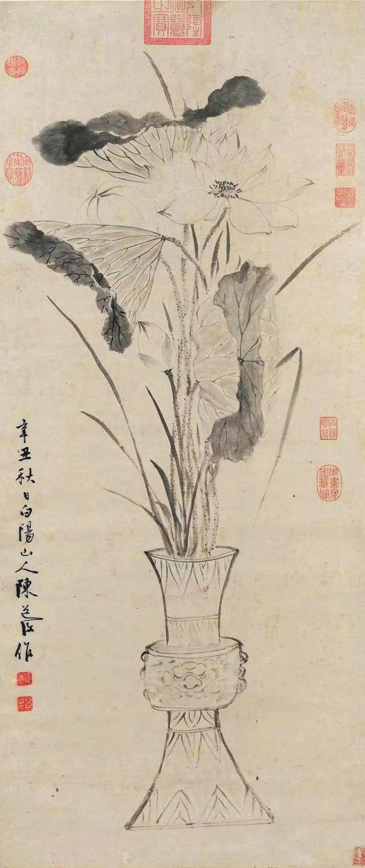 陳淳的《瓶荷寫(xiě)生圖》中,一青銅花觚內(nèi)插數(shù)枝荷花,細(xì)葉菖蒲點(diǎn)綴其間。向上伸展的枝葉幾乎占滿(mǎn)畫(huà)面,盡顯夏日花草的勁挺之氣與蓬勃生機(jī)。此作給人最大的視覺(jué)感受是不拘一格的瀟灑筆觸與靈動(dòng)造型,尤其靠下方的兩片荷葉,以及右側(cè)彎折垂下的一片細(xì)葉,甚至顯現(xiàn)出一絲不加修飾的潦草、頹敗之感,而恰是對(duì)此等細(xì)節(jié)的保留,生動(dòng)體現(xiàn)出植物自然的生長(zhǎng)姿態(tài)。