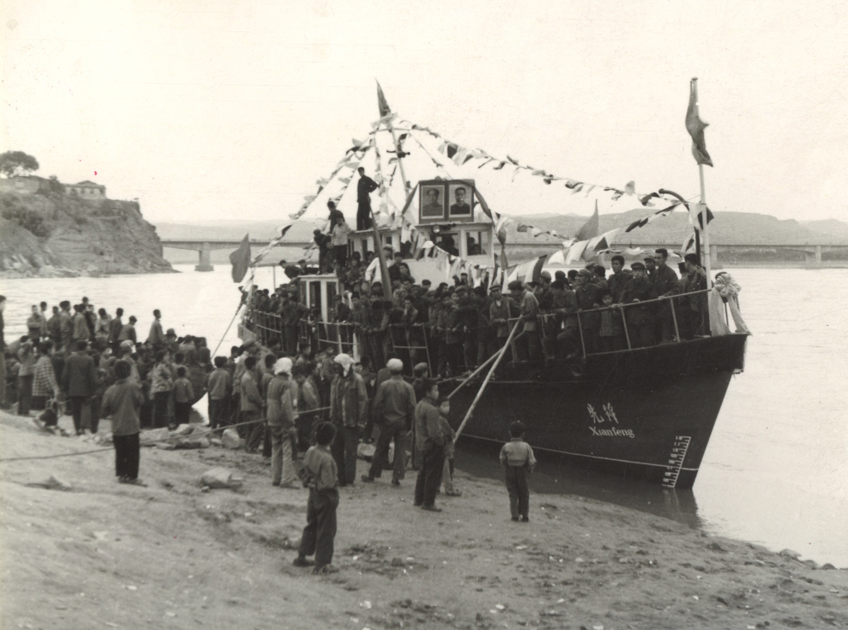 保德縣的木船造得快,取名“先鋒號(hào)”,于1977年5月23日,農(nóng)歷四月初六正式下水。這是晉陜峽谷有史以來第一艘機(jī)動(dòng)船,千年未有之新鮮事,少不了要隆重慶賀。有老照片記錄當(dāng)年盛況:黃河水流浩大,“先鋒號(hào)”泊于岸邊,駕駛艙頂上并排矗立著偉人的大幅畫像,上用紅綢花裝飾,船頭船尾紅旗招展,四條彩帶從駕駛艙頂端連向船沿。縣領(lǐng)導(dǎo)排坐于船上,禮儀小姐扯著紅綢,河岸上站滿了看熱鬧的群眾。河風(fēng)吹動(dòng)大小旗幟,機(jī)船顯得威風(fēng)凜凜。