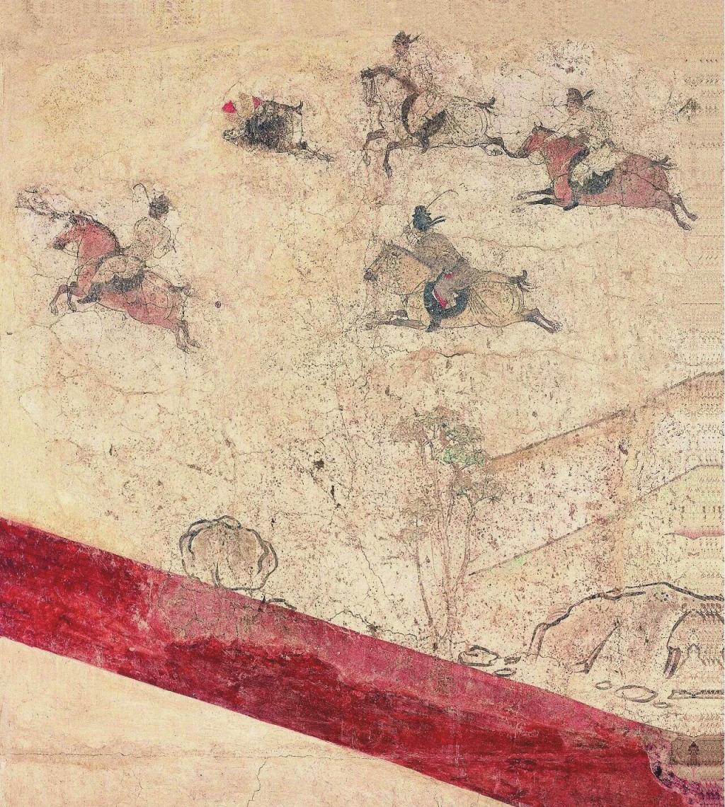 初唐淮安王李壽墓墓道東壁的《備馬出行圖》中,42匹青、灰、白、紅、褐各色交織的駿馬昂首闊步,馬上騎士手持紅旗,相互顧盼,一派王公貴胄儀仗出行的煊赫氣象;盛唐章懷太子李賢墓道西壁的《馬球圖》,20余騎馳騁如風,青山古樹為幕,馬蹄翻飛間盡顯“神駿追風”的活力……這些定格在墻壁上的身影,不僅是唐代繪畫藝術(shù)的瑰寶,更是一扇窺見唐人生活脈搏的窗口。