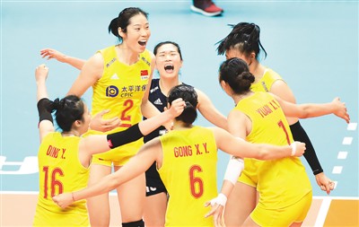中國女排在比賽中慶祝得分。