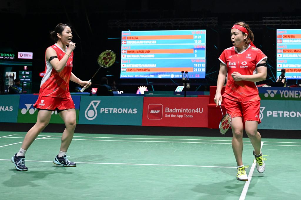 1月11日,陳清晨(右)/賈一凡在比賽中慶祝得分。新華社記者程一恒攝