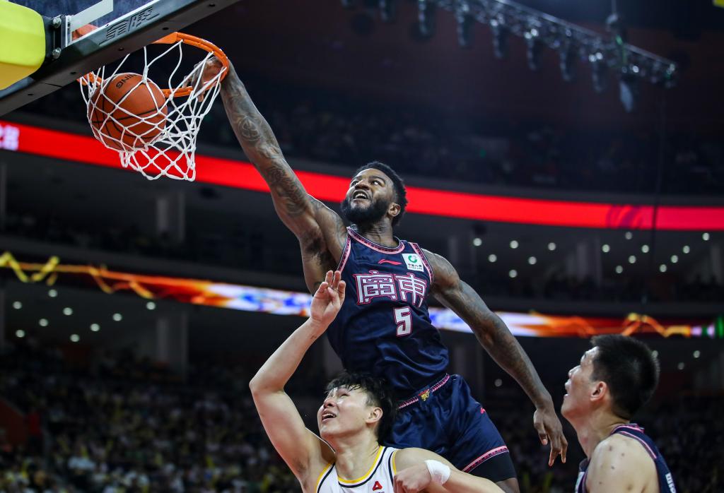 4月18日,廣東隊球員貝爾(上)在比賽中扣籃。新華社發(fā)(鄭家雄攝)