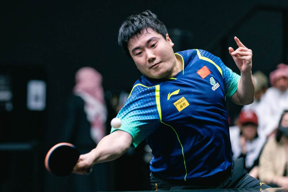 5月6日,中國選手梁靖崑在比賽中回球,他在男單第二輪比賽中2比3不敵伊朗選手阿拉米揚(yáng)。新華社發(fā)(WTT世界乒聯(lián)供圖)
