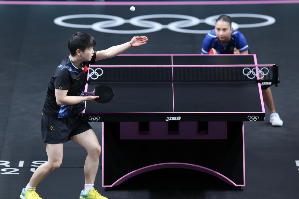 7月28日,孫穎莎(左)在比賽中發(fā)球。新華社記者 劉續(xù) 攝