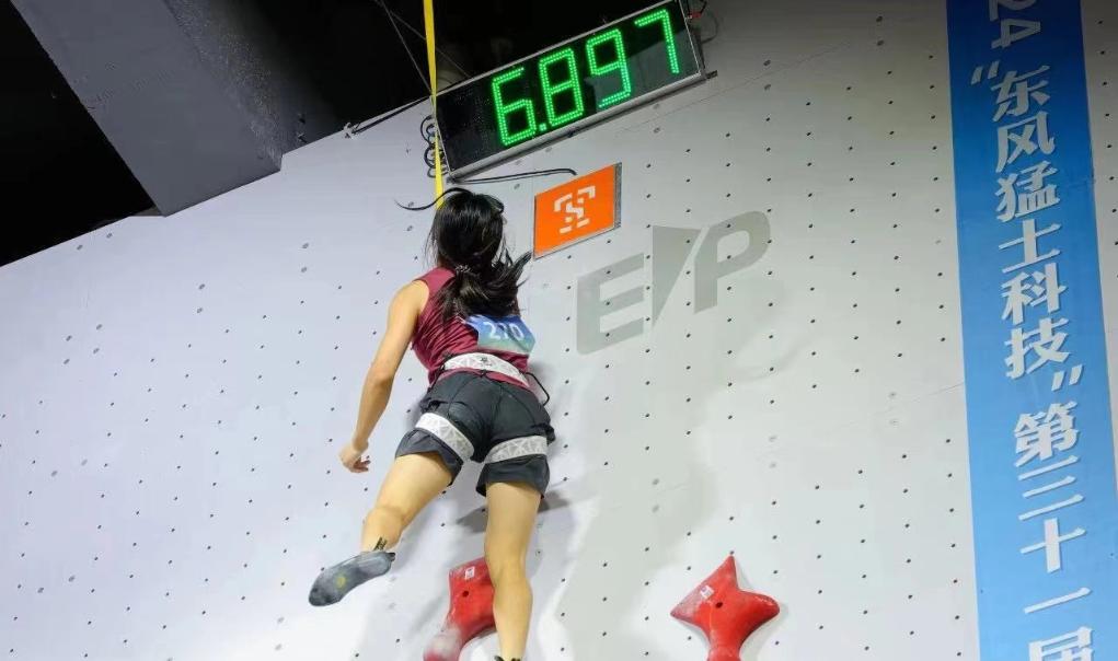 蒙世雪在女子半決賽中與周婭菲遭遇,后者在最后時(shí)刻失誤,蒙世雪爬出6秒82的個(gè)人最好成績(jī)晉級(jí)。決賽對(duì)陣隊(duì)友牟玉菊,她爬出6秒89摘金。