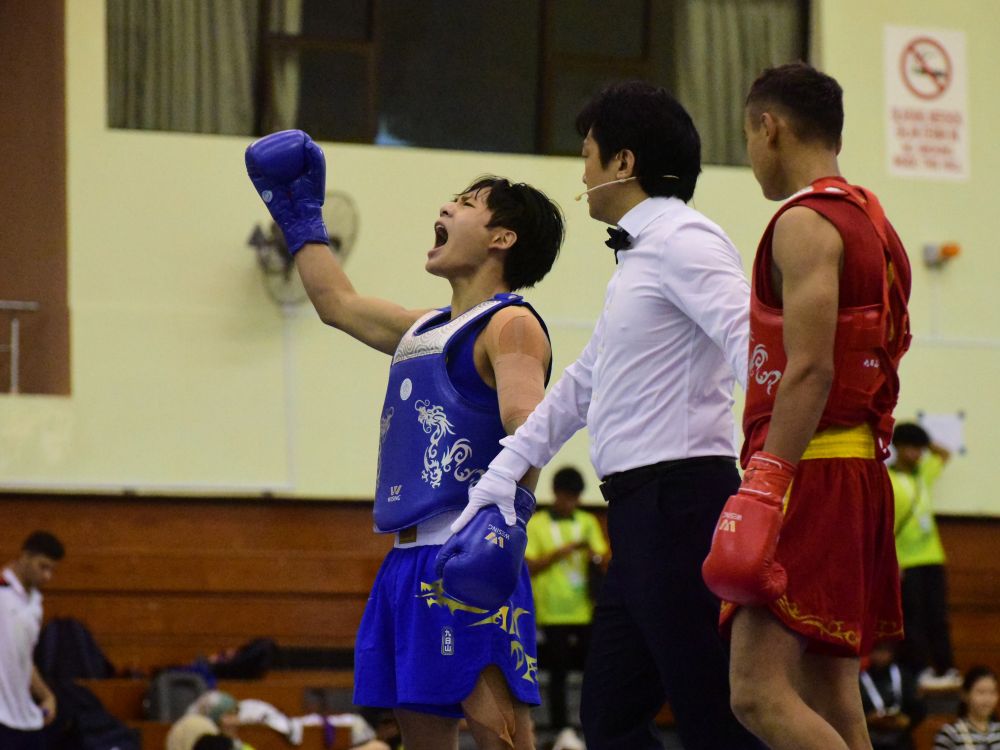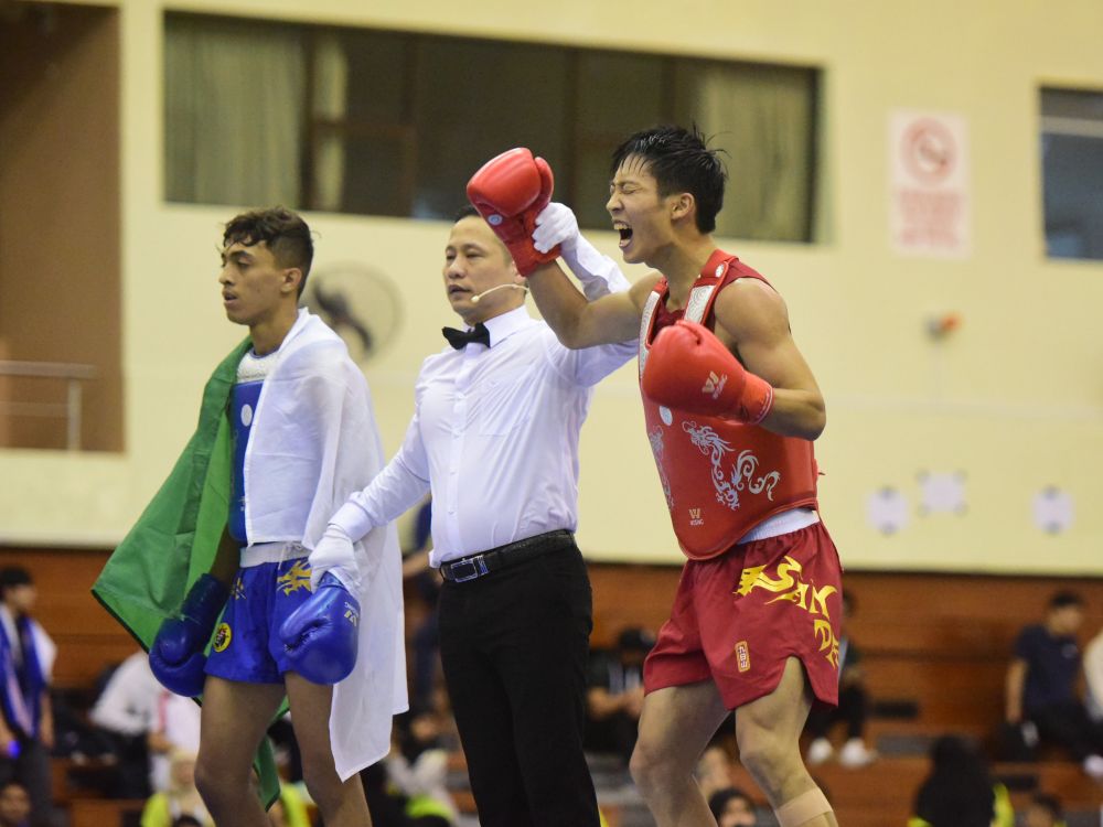 9月29日,在文萊舉行的第九屆世界青少年武術(shù)錦標(biāo)賽散打男子56公斤級(jí)決賽中,中國(guó)選手馮俊杰戰(zhàn)勝烏茲別克斯坦選手奧季洛夫,獲得冠軍。新華社記者 李萌 攝