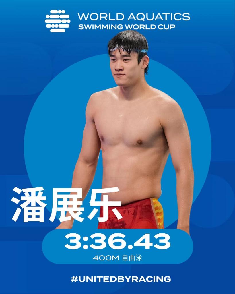 在男子400米自由泳決賽中,潘展樂采取最后100米沖刺的方式強(qiáng)力反超其他選手,以3分36秒43的個(gè)人最好成績(jī)力拔頭籌,并達(dá)到參加年底布達(dá)佩斯短池世錦賽該項(xiàng)目的成績(jī)A標(biāo)。