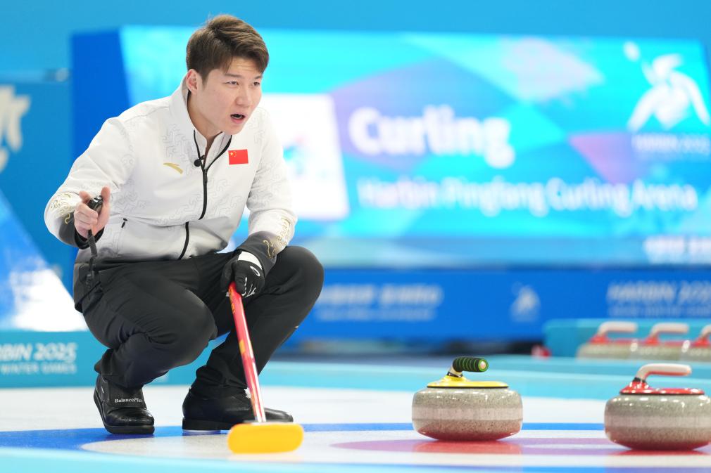 2月6日,中國隊選手韓雨在比賽中。當日,在哈爾濱舉行的第九屆亞冬會冰壺混雙循環(huán)賽B組第8輪比賽中,中國隊10比1戰(zhàn)勝卡塔爾隊。新華社記者 王楷焱 攝