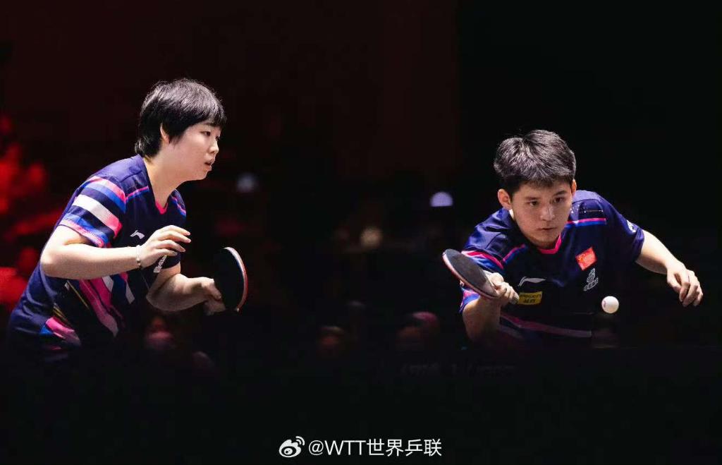 2月7日,林詩(shī)棟(右)/蒯曼在比賽中。圖片來(lái)自世界乒聯(lián)官方微博