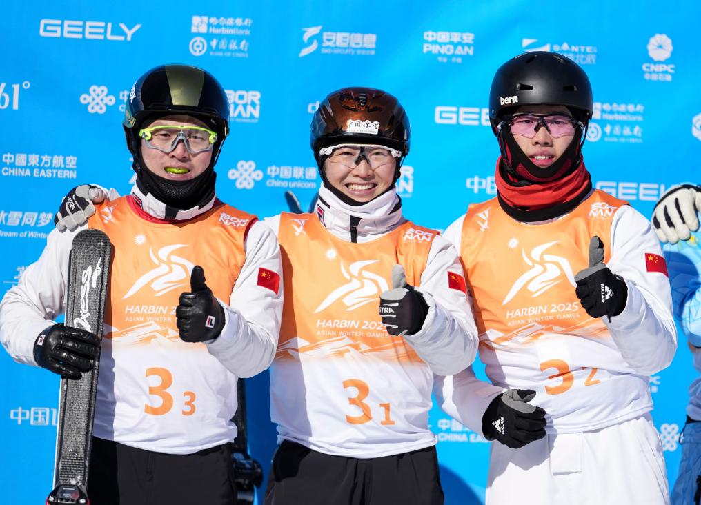 2月10日,齊廣璞、徐夢桃和李心鵬(從左至右)在賽后合影。當(dāng)日,在亞布力舉行的第九屆亞冬會自由式滑雪空中技巧混合團(tuán)體決賽中,中國隊奪冠。新華社記者 賴向東 攝