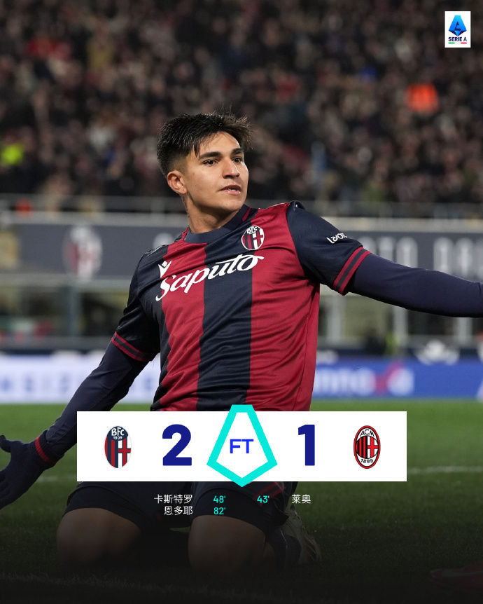易邊再戰(zhàn),博洛尼亞在第48分鐘利用一次定位球機會,由法比安助攻卡斯特羅門前近距離推射破門,扳平比分。盡管米蘭抗議對方手球在先,但視頻助理裁判(VAR)和主裁判判定進(jìn)球有效。經(jīng)過一段時間的對攻后,第82分鐘,米蘭后防出現(xiàn)漏洞,坎比亞吉為恩多耶送上橫傳助攻,后者近距離搶點破門,幫助博洛尼亞2:1反超比分。