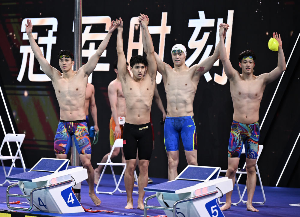 男子4X200米自由泳接力決賽,由汪順、費(fèi)立緯、孫楊和潘展樂(lè)組成的浙江隊(duì)以7分12秒76的成績(jī)奪冠。第一棒汪順為浙江隊(duì)建立優(yōu)勢(shì),交接時(shí)已超出第二名一個(gè)身位,此后費(fèi)立緯繼續(xù)擴(kuò)大領(lǐng)先,孫楊和潘展樂(lè)沒(méi)有給對(duì)手追趕的機(jī)會(huì),浙江隊(duì)以領(lǐng)先第二名超過(guò)3秒的優(yōu)勢(shì)奪冠。山東隊(duì)和公安體育協(xié)會(huì)隊(duì)分列二、三位。