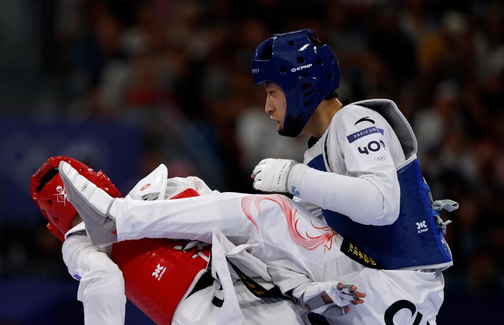 2024年8月8日,中國選手梁育帥(右)在巴黎奧運會跆拳道男子68公斤級16強賽上。新華社記者 費茂華 攝