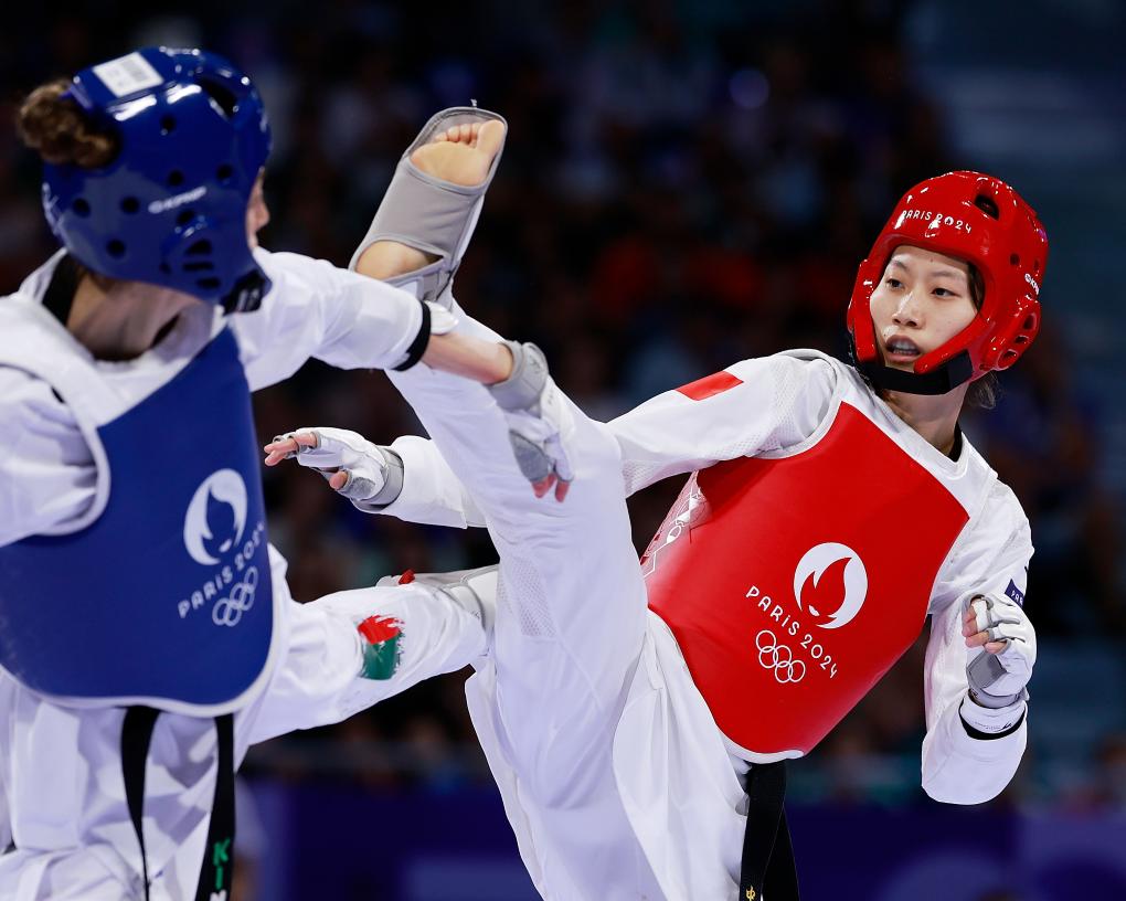 2024年8月8日,中國選手駱宗詩(右)在巴黎奧運會跆拳道項目女子57公斤級銅牌賽上。新華社記者 費茂華 攝