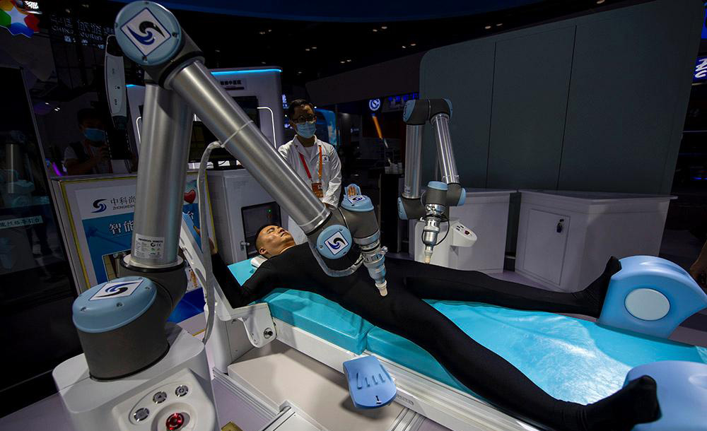 △2020年服貿(mào)會綜合展區(qū),參觀者正在體驗中醫(yī)智能經(jīng)絡導引機器人。