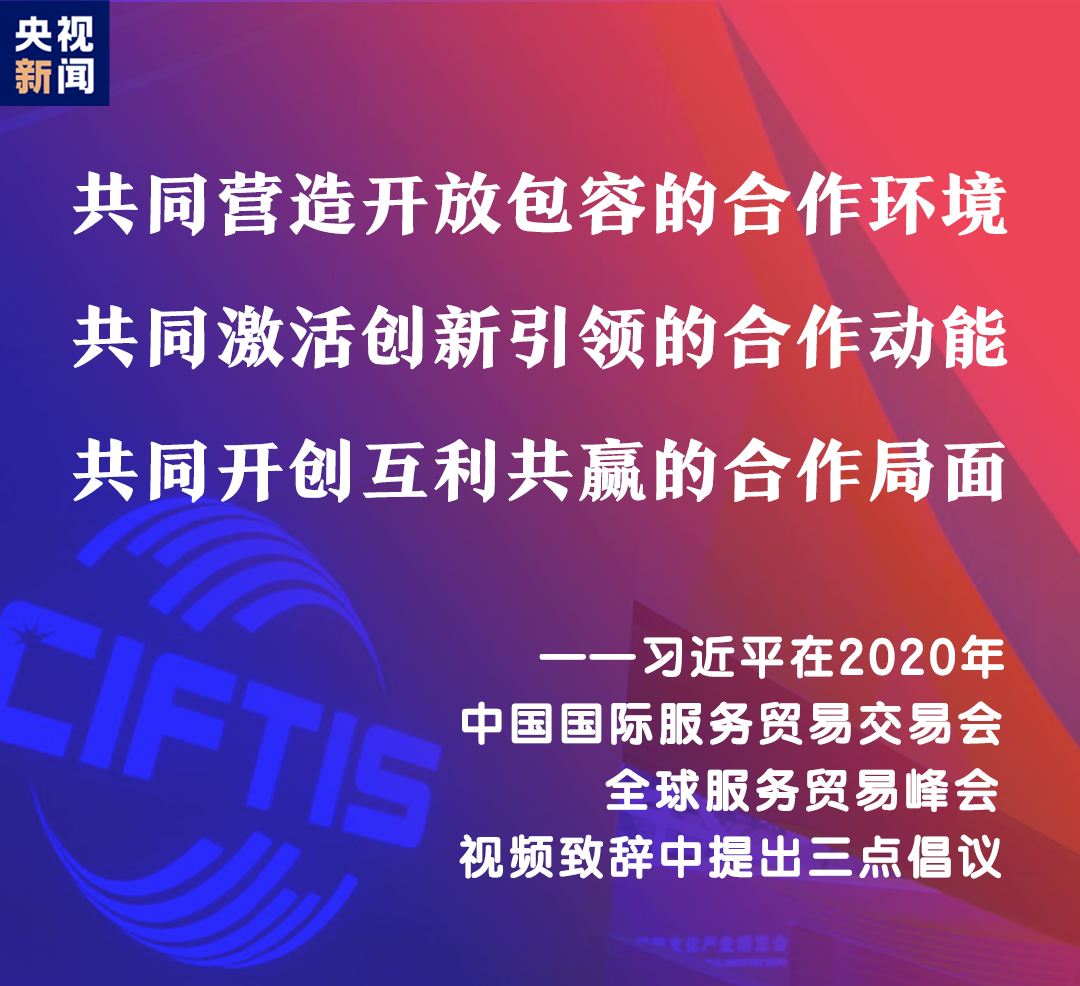 習近平表示,中國舉辦2020年中國國際服務貿(mào)易交易會,就是搭建起平臺和橋梁,讓各國人民充分展示服務貿(mào)易領域新發(fā)展新突破,共同享受人類社會發(fā)展進步新技術(shù)新成果。