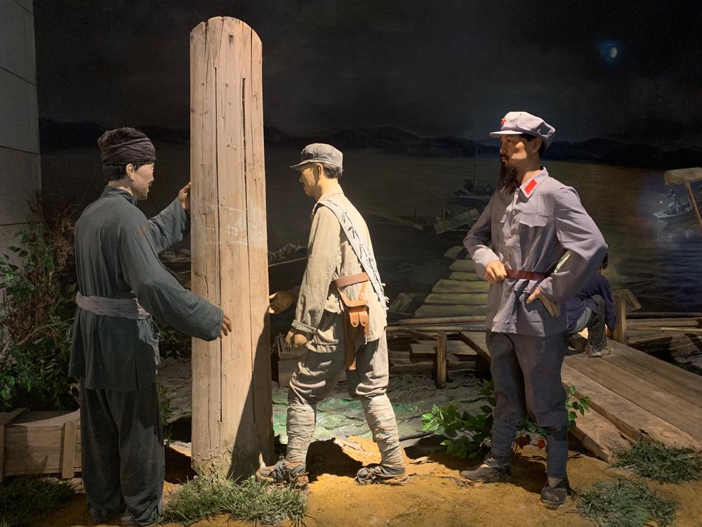 △中央紅軍出發(fā)紀(jì)念館再現(xiàn)于都老人將自己的棺木捐給紅軍搭浮橋的場景。(總臺(tái)央視記者郭晗光拍攝)