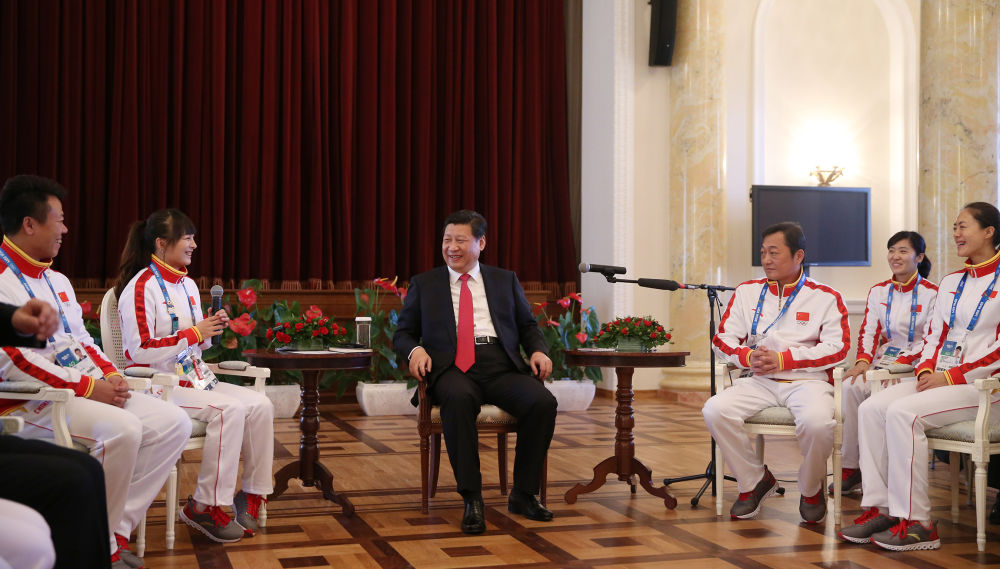 2014年2月7日,中共中央總書記、國家主席、中央軍委主席習(xí)近平在俄羅斯索契親切看望參加第二十二屆冬季奧林匹克運(yùn)動(dòng)會(huì)的中國體育代表團(tuán)。這是習(xí)近平在座談會(huì)上與代表團(tuán)成員親切交流。新華社記者 蘭紅光 攝
