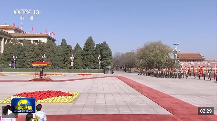哇集拉隆功抵達(dá)時(shí),禮兵列隊(duì)致敬。習(xí)近平同哇集拉隆功登上檢閱臺(tái),軍樂團(tuán)奏中國國歌和泰國頌圣歌,天安門廣場鳴放禮炮21響。哇集拉隆功在習(xí)近平陪同下檢閱中國人民解放軍儀仗隊(duì),并觀看分列式。
