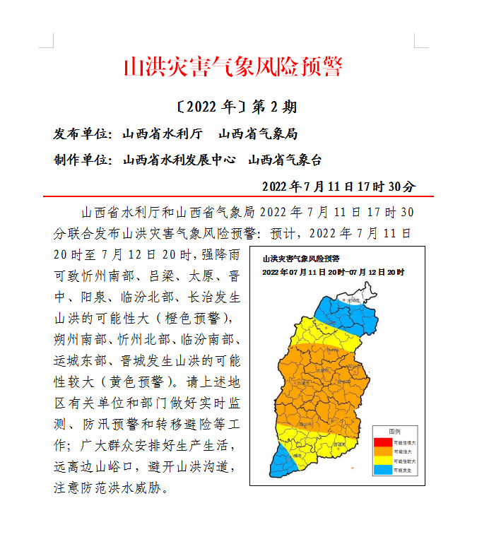 山西發(fā)布山洪災(zāi)害氣象風(fēng)險(xiǎn)預(yù)警 山西省水利廳和山西省氣象局2022年7月11日17時(shí)30分聯(lián)合發(fā)布山洪災(zāi)害氣象風(fēng)險(xiǎn)預(yù)警:預(yù)計(jì),2022年7月11日20時(shí)至7月12日20時(shí),強(qiáng)降雨可致忻州南部、呂梁、太原、晉中、陽(yáng)泉、臨汾北部、長(zhǎng)治發(fā)生山洪的可能性大(橙色預(yù)警),朔州南部、忻州北部、臨汾南部、運(yùn)城東部、晉城發(fā)生山洪的可能性較大(黃色預(yù)警)。