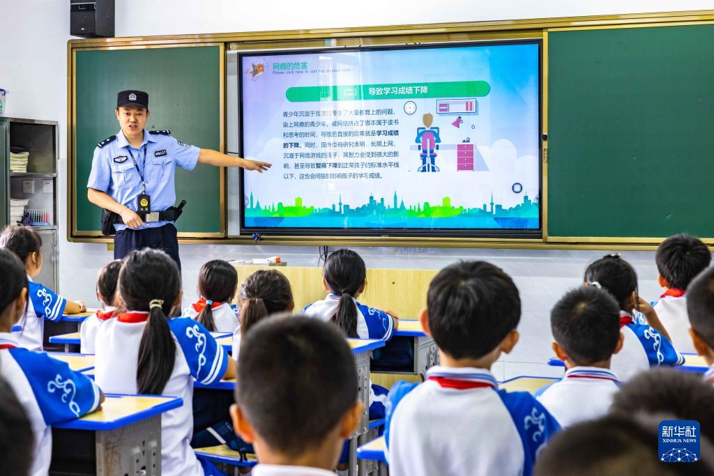 9月11日,貴州省安順市公安局西秀分局民警在安順市第七小學為學生講解不良上網(wǎng)習慣的危害。(新華社發(fā) 陳熙 攝)