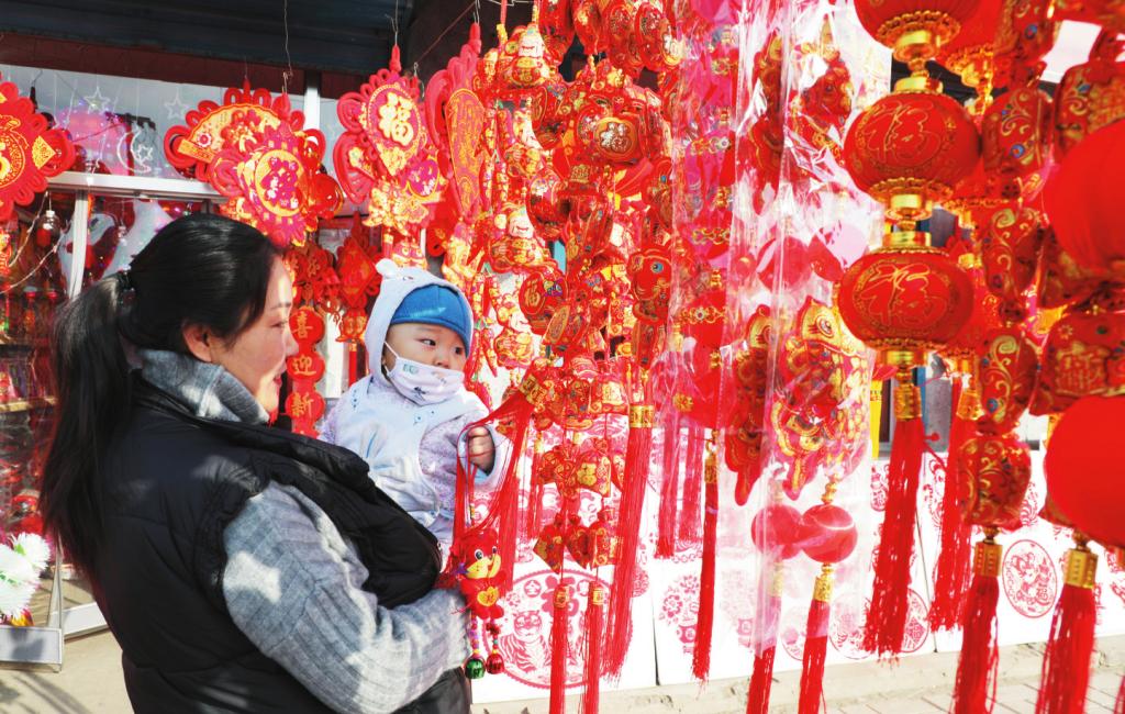 近日,在原平市小集鎮(zhèn)批發(fā)市場(chǎng),人們紛紛選購大紅“?!弊帧⒓t燈籠、中國結(jié)、春聯(lián)、生肖虎元素的節(jié)日喜慶物品,紅紅火火迎接新春佳節(jié)。 (褚 震 攝)