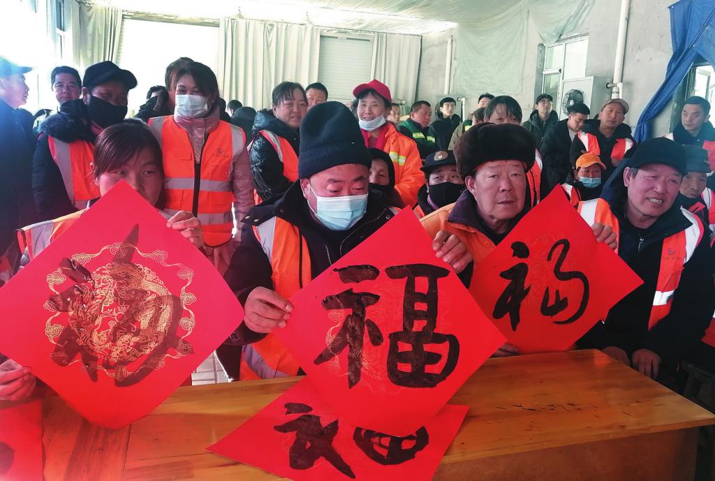 1月19日,民建忻州市委組織書(shū)法會(huì)員赴靜樂(lè)縣為50名環(huán)衛(wèi)和園林工人現(xiàn)場(chǎng)寫(xiě)春聯(lián),并送上節(jié)日的問(wèn)候。本報(bào)記者 李濤攝