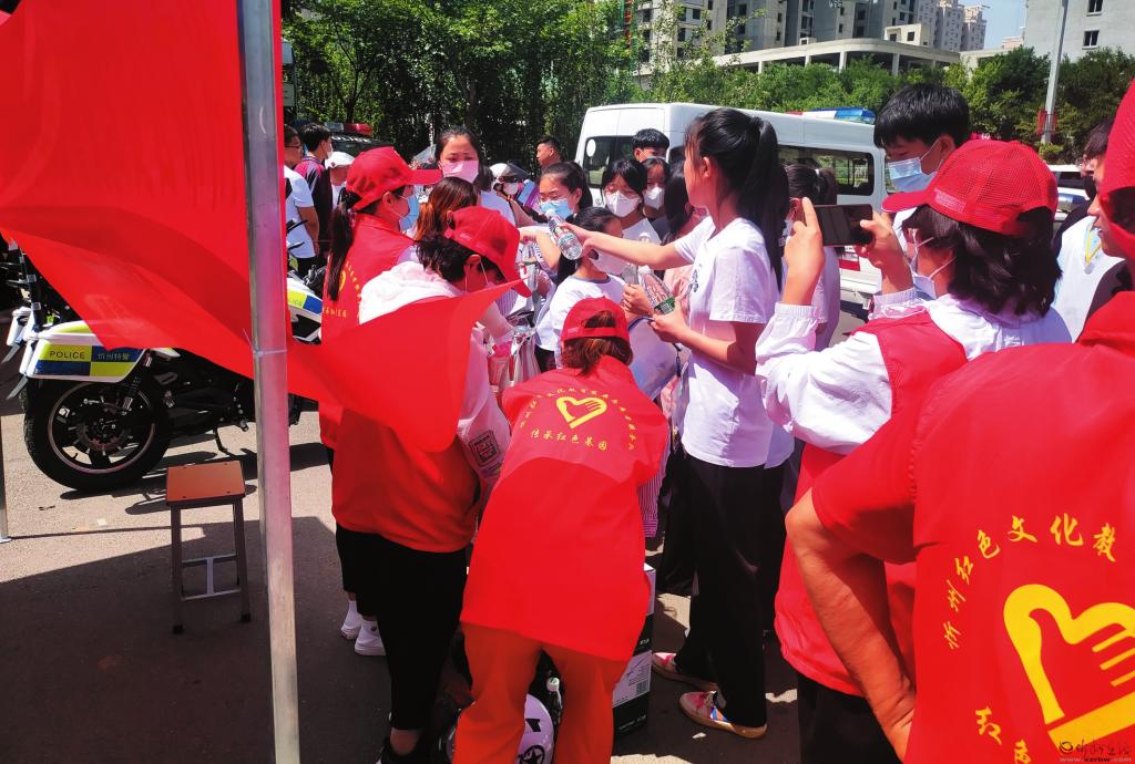身穿愛心紅馬甲的志愿者為考生免費送去礦泉水。 張志遠(yuǎn)攝