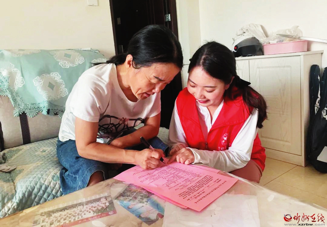 志愿者在居民家中指導居民填寫調查問卷。劉慧 攝