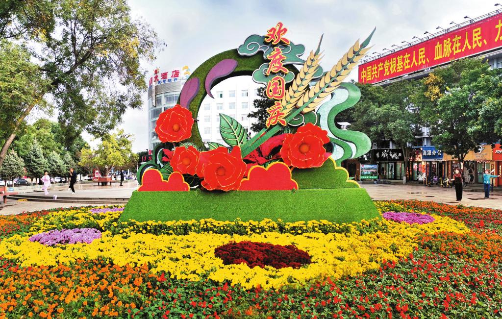 “十一”臨近,“歡度國慶”主題花壇亮相忻州城區(qū)日月廣場(chǎng)。(宮清華 攝)