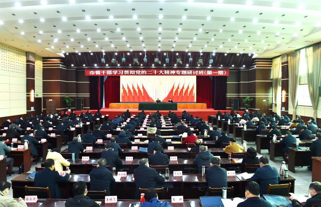 市管干部學(xué)習(xí)貫徹黨的二十大精神專題研討班現(xiàn)場(chǎng)。馮曉磊 攝 2月6日,市管干部學(xué)習(xí)貫徹黨的二十大精神專題研討班在市委黨校開(kāi)班。市委書(shū)記朱曉東出席開(kāi)班式并講話。他強(qiáng)調(diào),要持續(xù)在全面學(xué)習(xí)、全面把握、全面落實(shí)黨的二十大精神上下功夫,真正做到認(rèn)識(shí)充分、思想統(tǒng)一,行動(dòng)見(jiàn)效、落實(shí)有力,把學(xué)習(xí)宣傳貫徹黨的二十大精神煥發(fā)出的熱情,轉(zhuǎn)化為履職盡責(zé)、真抓實(shí)干的具體行動(dòng),把學(xué)習(xí)所獲切實(shí)運(yùn)用到中國(guó)式現(xiàn)代化忻州實(shí)踐當(dāng)中。市委副書(shū)記、市長(zhǎng)李建國(guó)主持開(kāi)班式。